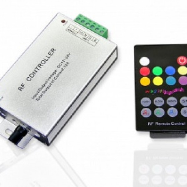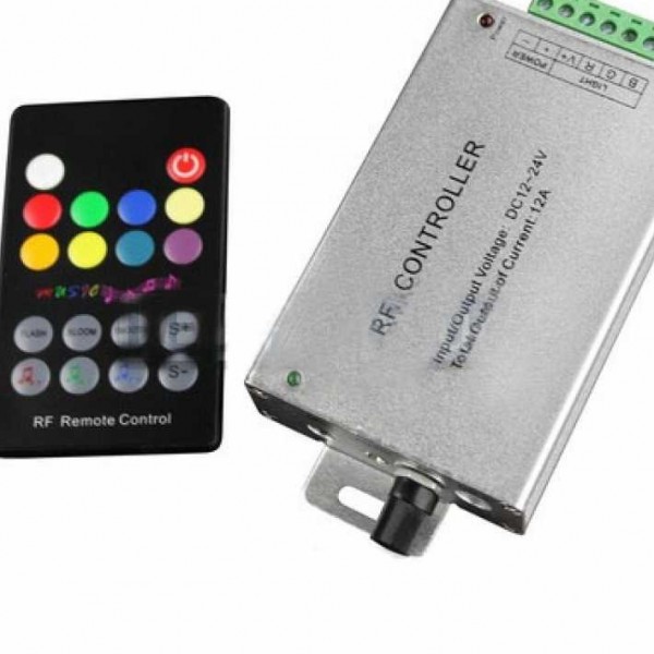 RGB-контроллер с RF ДУ (18 кнопок), регулировка яркости, цветности, скорости. Вход аудио и внешнего микрофона, регулировка усиления. Выход 12/24V 144/288W, до 12A. Габариты 130х64х24 мм. Стоимость указана без учета НДС.