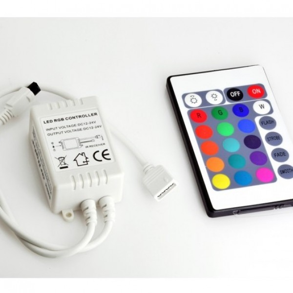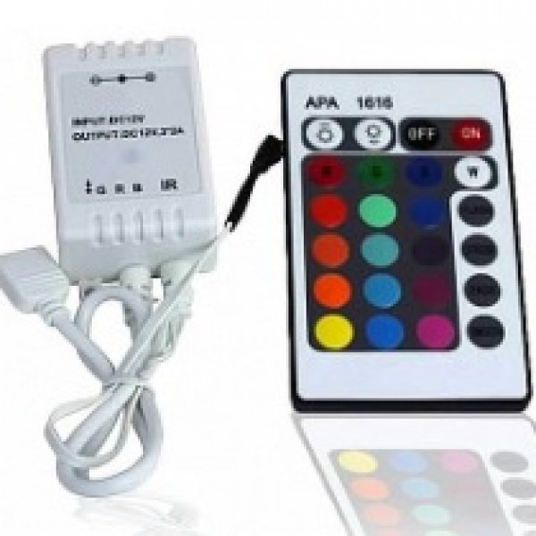 Контроллер для управления светодиодной лентой RGB, ИК-пульт, 24 кнопки, входное напряжение 12/24V, мощность 72/144W, размеры приемника 62x35x22мм, размеры пульта 84x51x7. Возможность подключения контроллера к сетевому адаптеру напрямую (при помощи специального разъема 5,5x2.5). Стоимость указана без учета НДС.
