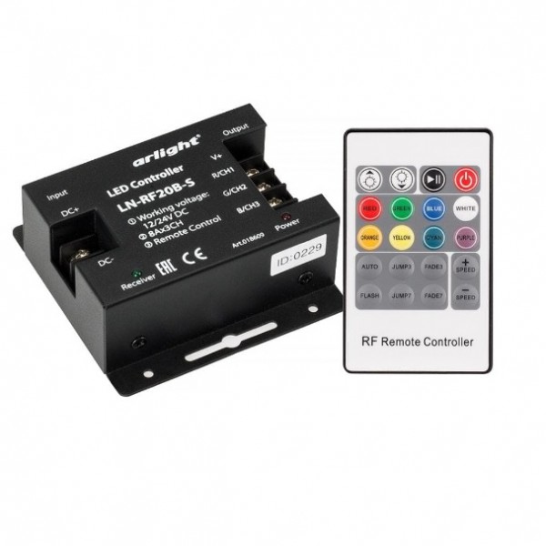 RGB-контроллер увеличенной мощности с RF (радио) пультом 20 кнопок. 21 программа, скорость, яркость, прямой выбор цвета. Вход/выход 12-24VDC, макс.ток 3х8А. Выходная мощность 12V:<288W, 24V:<576W. Клеммы для подключения. Размеры 83x79x33 мм. Стоимость указана без учета НДС.